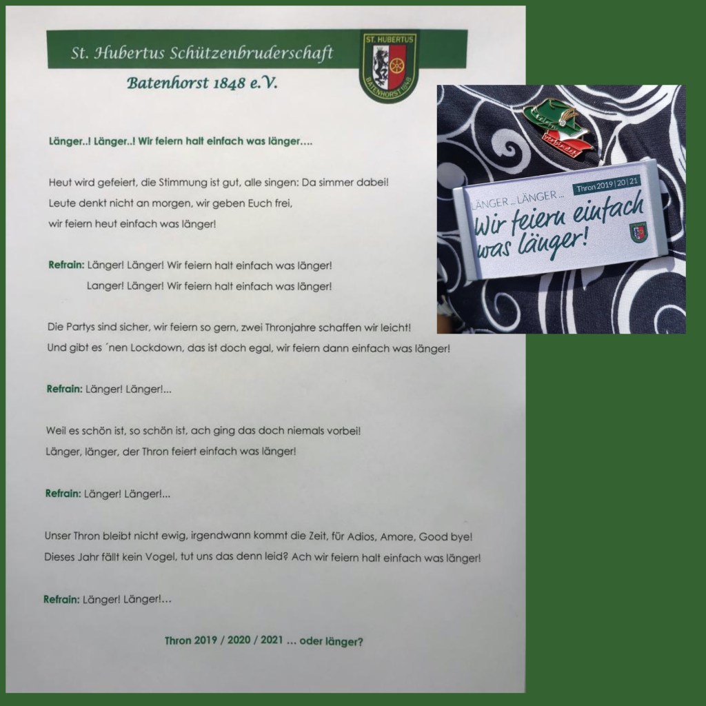 Wir sind uns auch sicher, dass Ihr in kleinen Gruppen unter Einhaltung der Abstandsregeln und Hygienevorschriften unserem Schützenfest, nennen wir es mal gedenken werdet.