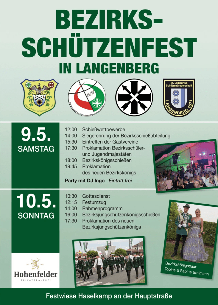 Am 09. und 10. Mai sind wir beim Bezirkschützenfest in Langenberg zu Gast und freuen uns auf ein gemeinsames Wochenende mit guter Stimmung und vielen bekannten Gesichtern.